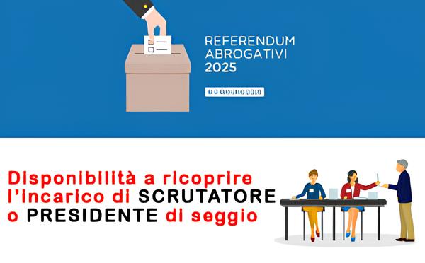 Si rende noto che è in corso la formazione di un elenco di elettori preventivamente disponibili a svolgere le funzioni di Presidente o Scrutatore di seggio per le elezioni dell’8 e 9 giugno 2025, al quale si potrà attingere nei casi di improvvisa assenza dei componenti originariamente nominati presso gli uffici sezionali e in presenza dell’impossibilità della loro sostituzione tramite le consuete modalità.