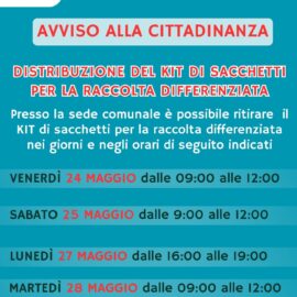 Ritiro gratuito kit sacchetti differenziata presso Comune nei seguenti orari: Venerdì 24 Maggio , Sabato 25 Maggio e Martedì 28 maggio dalle 9:00 alle ore 12:00 e Lunedì 27 Maggio dalle ore 16:00 alle ore 19:00.